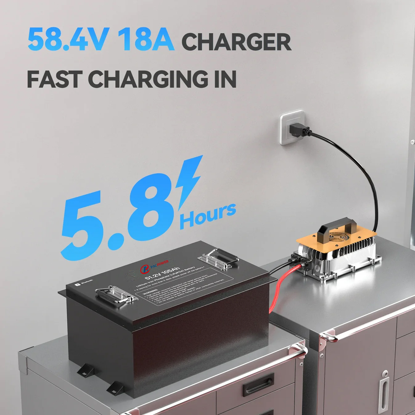 Comes with a 58.4V 18A LiFePO4 charger, which supports fast
